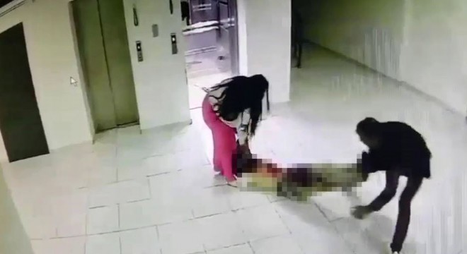 Binanın güvenlik kamerasına yansıyan görüntülerde İ.A.'nın diğer dayısı ile birlikte yaraladığı dayısı Murat T'yi sürükleyerek taşıdıkları görüldü.