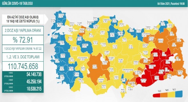 Sağlık Bakanlığı 2’inci doz aşı haritasını yayımladı.4 Ekim Pazartesi günkü, Kırmızı, Turuncu, Sarı ve Mavi renklerle aşı olma oranlarının verildiği haritada, Bingöl, Bitlis, Muş, Ağrı, illeri kırmızı, Erzurum, Kars, Van, Hakkari, Iğdır, Elazığ illeri turuncu; Erzincan, Malatya, Tunceli, Ardahan illeri ise sarı kategoride değerlendirildi.