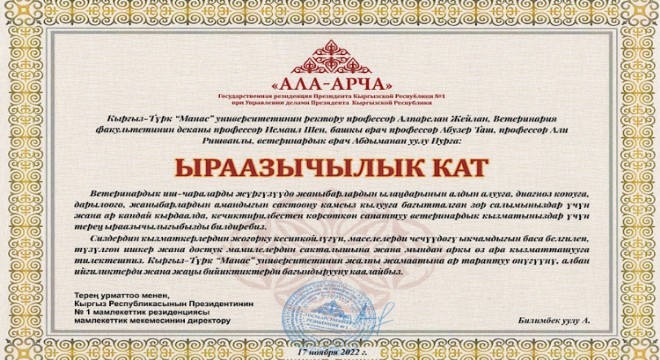 Kırgız Cumhuriyeti Cumhurbaşkanlığı Ala-Arça Konutu Sorumlu Müdürü A. Bilbek uulu imzalı Belgeyle Rektör Prof. Dr. Alpaslan Ceylan, Veteriner Fakültesi Dekan Vekili Prof. Dr. İsmail Şen, öğretim üyeleri Prof. Dr. Abuzer Taş, Prof. Ali Rişvanlı ile Veteriner Hekim Nur Abdımanap uulu’na sosyal fayda sağlayan çalışmalarından dolayı teşekkür edildi.