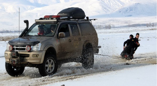 Erzurum Macera Off-Road Kulübü üyeleri, soğuk kış günlerini eğlenceli hale getirmek için dev arazi araçlarının arkasına bağlanan lastiklerin üzerine çıkıp, kar üzerinde kayarak "Lastik Raftingi" yapmanın heyecanını yaşıyor.