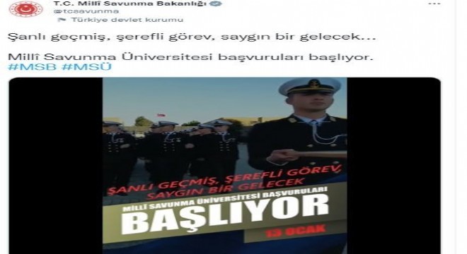Milli Savunma Bakanlığının resmi sosyal medya hesabından yapılan ve Milli Savunma Üniversitesi öğrencilerinin görüntülerinin de yer aldığı paylaşımda, 'Şanlı geçmiş, şerefli görev, saygın bir gelecek' sözleriyle Milli Savunma Üniversitesi başvurularının 13 Ocak'ta başlayacağı duyuruldu.