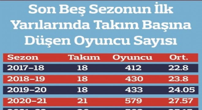 Geçtiğimiz sezon Süper Lig'in ilk yarısında forma giyen 579 oyuncudan 262'si milli takımda oynama yeterliliğine sahip, yerli oyunculardı. Bu oyuncuların toplam sayı içindeki oranı yüzde 45.25'i bulmuştu. Buna karşılık yerli oyuncular toplam 415 bin 800 dakikalık ilk yarıda 143 bin 604 dakika forma şansı bulmuş, bu rakamın oransal karşılığı da yüzde 34.53 olmuştu.